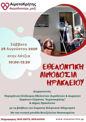 Εθελοντική Αιμοδοσία θα πραγματοποιηθεί το Σάββατο 29.08.2020 στο κέντρο της πόλης του Ηρακλείου (στο Αίθριο της Λότζια), από τις 10:00 έως τις 13:30. Πρόκειται για μια κοινή προσπάθεια αιμοδοσίας, την οποία συντονίζουν: