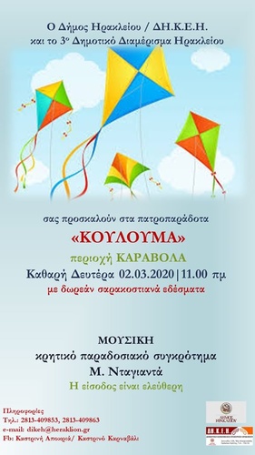 Ο Δήμος Ηρακλείου την Καθαρά Δευτέρα 2 Μαρτίου στις 11:00 γιορτάζει τα Κούλουμα στον Καράβολα, με το πέταγμα του χαρταετού,  με δωρεάν σαρακοστιανά εδέσματα για όλους και κρητική παραδοσιακή μουσική, χορό και τραγούδι από το συγκρότημα του Μ. Νταγιαντά.