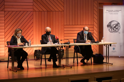 Στην Αίθουσα Συναυλιών του Πολιτιστικού Συνεδριακού Κέντρου Ηρακλείου, με την τήρηση όλων των προβλεπόμενων μέτρων ατομικής προστασίας, πραγματοποιήθηκε η παρουσίαση του προγράμματος του πρώτου τριμήνου της καλλιτεχνικής περιόδου 2020 – ‘21 από τον Δήμαρχο Ηρακλείου κ. Βασίλη Λαμπρινό, την Πρόεδρο ΔΕΠΑΝΑΛ Α.Ε. κ. Ευαγγελία Σχοιναράκη – Ηλιάκη και τον Καλλιτεχνικό Διευθυντή του ΠΣΚΗ κ. Μύρωνα Μιχαηλίδη.