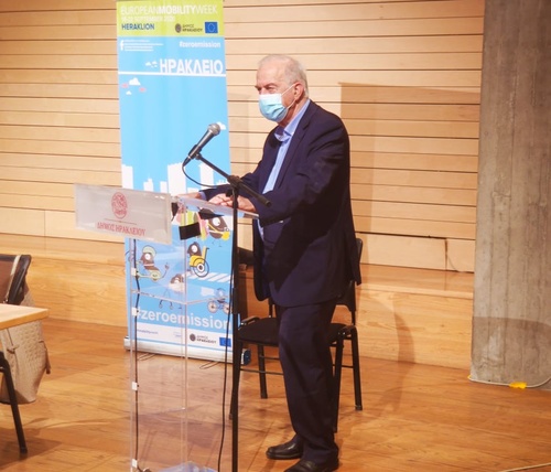 Ακολούθησε χαιρετισμός του Δημάρχου Ηρακλείου, κ. Βασίλη Λαμπρινού, ο οποίος τόνισε την ουσιαστική συμβολή της τοπικής κοινωνίας στο συ-σχεδιασμό των παρεμβάσεων που αφορούν στο Σχέδιο Βιώσιμης Αστικής Κινητικότητας, και εν γένει στην κυκλοφορία στην πόλη με στόχο την ταυτόχρονη μείωση του περιβαλλοντικού αποτυπώματος, με έμφαση στους εναλλακτικούς τρόπους μετακίνησης, καθώς και τη μείωση της χρήσης των ιδιωτικών αυτοκινήτων.