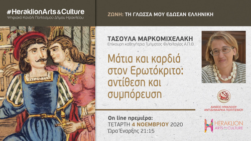 Το θέμα είναι ο ανεξάντλητος Ερωτόκριτος, αυτό το αριστούργημα της Κρητικής Λογοτεχνίας. Η έγκριτη επιστήμονας και καθηγήτρια του Αριστοτελείου Πανεπιστημίου Θεσσαλονίκης κ. Τασούλα Μαρκομιχελάκη θα μας μιλήσει για τα μυστικά του ποιητή, εκείνα που δεν είναι εμφανή εξ’ αρχής, αλλά αναμφίβολα υπάρχουν στον καμβά του έργου.
