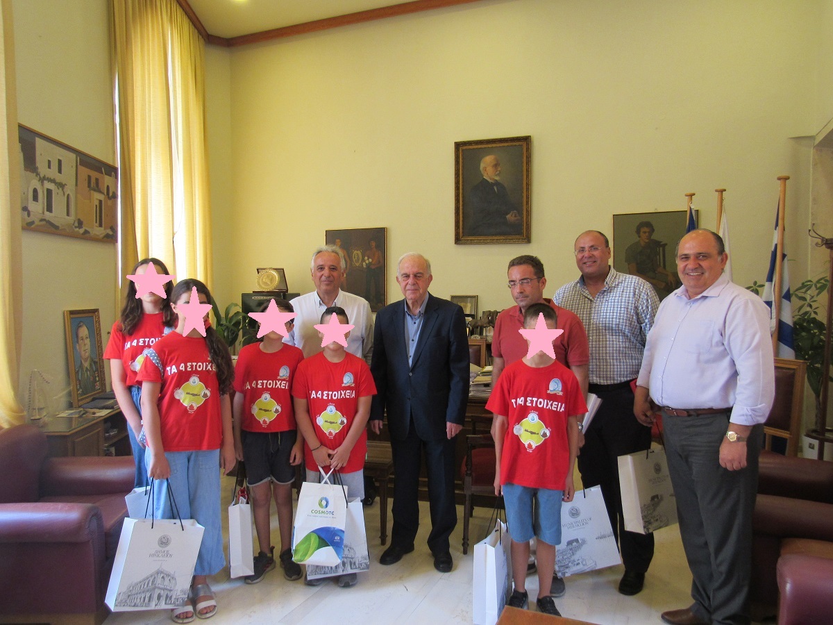 Τους 5 μαθητές του 12ου Δημοτικού Σχολείου Ηρακλείου που κέρδισαν το χρυσό βραβείο στα «EDUCATION LEADERS AWARDS» στην κατηγορία «Βέλτιστη Μαθησιακή Εμπειρία» στη Ρομποτική, κατηγορία Open  Δημοτικού, στον Πανελλήνιο Διαγωνισμό Εκπαιδευτικής Ρομποτικής -WRO συνάντησε σήμερα, Τετάρτη 8 Ιουλίου, στο γραφείο του στη Λότζια ο Δήμαρχος Ηρακλείου Βασίλης Λαμπρινός.