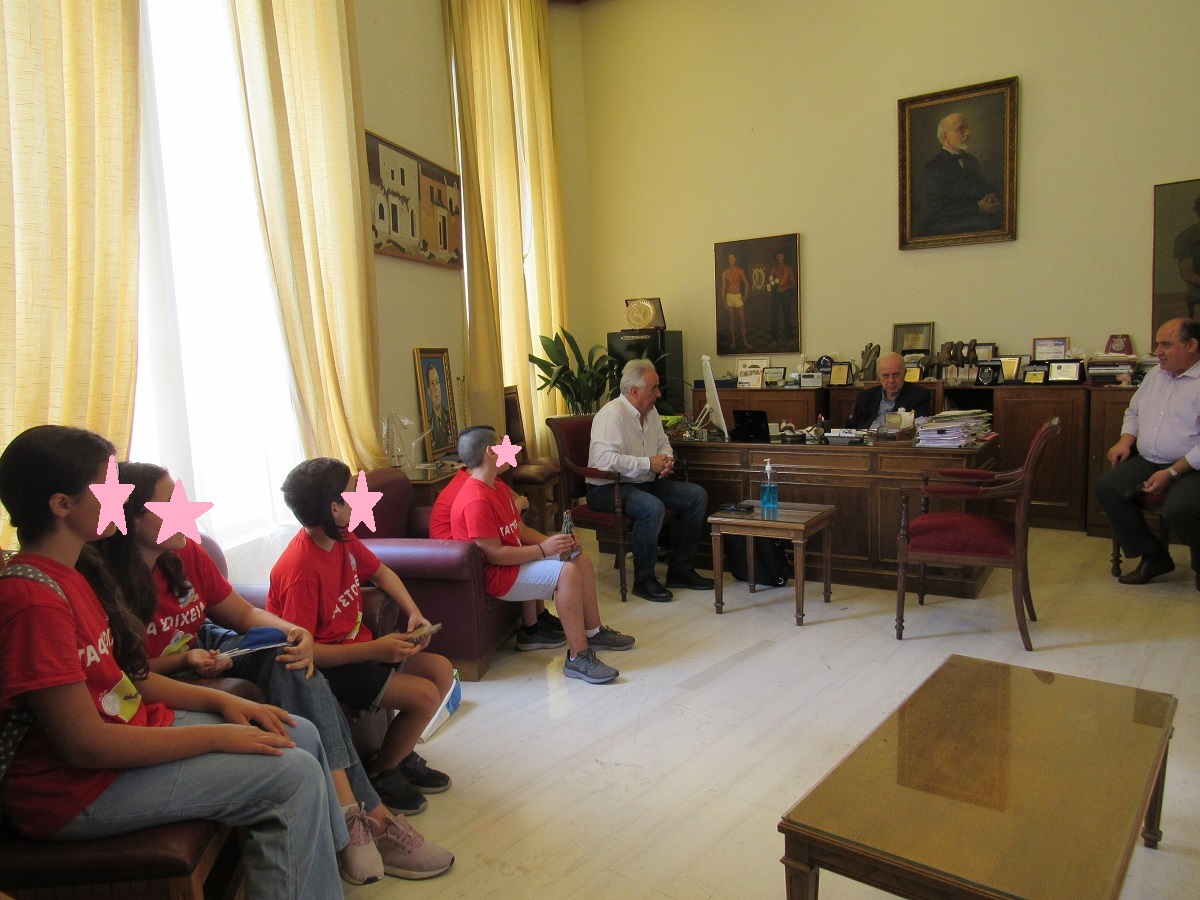 Οι μαθητές μαζί με τον Διευθυντή του σχολείου κ. Γιάννη Γαλανάκη και τον εκπαιδευτικό πληροφορικής κ. Αναστάσιο Ρίγγα συζήτησαν με τον Δήμαρχο, τον Αντιδήμαρχο Παιδείας Νίκο Αγγελάκη και τον πρόεδρο της Πρωτοβάθμιας Επιτροπής Παιδείας Αντώνη Περυσινάκη για την προσπάθεια που κατέβαλε η ομάδα του σχολείου μέχρι να φτάσει στο χρυσό βραβείο.
