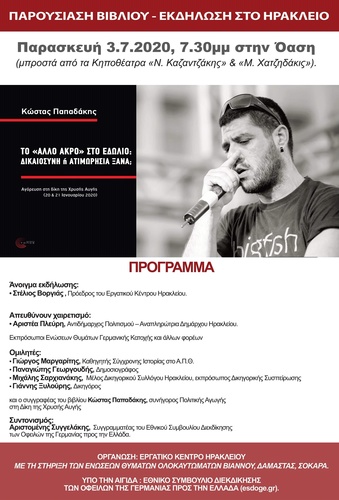 Λίγες μέρες μετά την επανέναρξη της πολύκροτης δίκης της Χρυσής Αυγής παρουσιάζεται στο Ηράκλειο το βιβλίο του δικηγόρου Κώστα Παπαδάκη (εκδόσεις Τόπος):