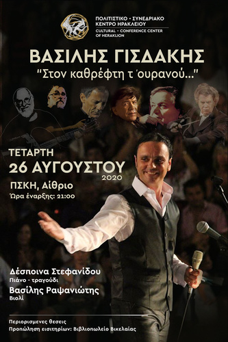 Παραστατική και λυρική, ευαίσθητη και αισθαντική, η φωνή του Βασίλη Γισδάκη, του τελευταίου ερμηνευτή συνεργάτη του Μάνου Χατζιδάκι, συναντά την Τετάρτη 26 Αυγούστου, στις 21:00, στο Αίθριο του ΠΣΚΗ, «Στον καθρέφτη τ’ ουρανού» την Δέσποινα Στεφανίδου (πιάνο - τραγούδι) και τον Βασίλη Ραψανιώτη (βιολί) σε ένα  μουσικό αφιέρωμα στους μεγάλους Έλληνες μουσικοσυνθέτες Μάνο Χατζιδάκι, Μίκη Θεοδωράκη, Μάνο Λοϊζο, Σταύρο Ξαρχάκο, Θάνο Μικρούτσικο, Γιώργο Ζαμπέτα, Γιάννη Μακρόπουλο, Δήμο Μούτση, Νίκο Ζούδιαρη, Μίμη Πλέσσα και άλλους, με αναφορές στο ρεμπέτικο και στα τραγούδια της ελληνικής παράδοσης.