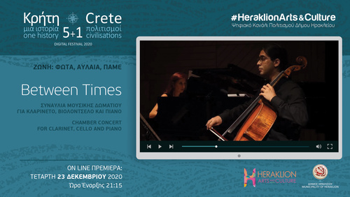 Με την συναυλία μουσικής δωματίου για κλαρινέτο, βιολοντσέλο και πιάνο “Between Times” συνεχίζονται την Τετάρτη 23 Δεκεμβρίου στις 21.15 οι προβολές στο ψηφιακό κανάλι πολιτισμού του Δήμου Ηρακλείου.