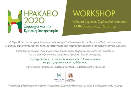 Ανοικτή συζήτηση εργασίας, με αντικείμενο την ανάδειξη του Ηρακλείου ως βασικό σημείο αναφοράς της Κρητικής Γαστρονομίας και δυναμικό Γαστρονομικό Προορισμό διεθνούς εμβέλειας, θα πραγματοποιηθεί την Δευτέρα 3 Φεβρουαρίου 2020 στις 16:00 στην αίθουσα «Ελ. Βενιζέλος», στη Λότζια.