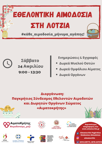 Εθελοντική Αιμοδοσία θα πραγματοποιηθεί το Σάββατο 24.04.2021 στο κέντρο της πόλης του Ηρακλείου (στο Αίθριο της Λότζια),  από τις 09:00 έως τις 13:30.  Πρόκειται για μια κοινή προσπάθεια αιμοδοσίας, την οποία συντονίζουν: