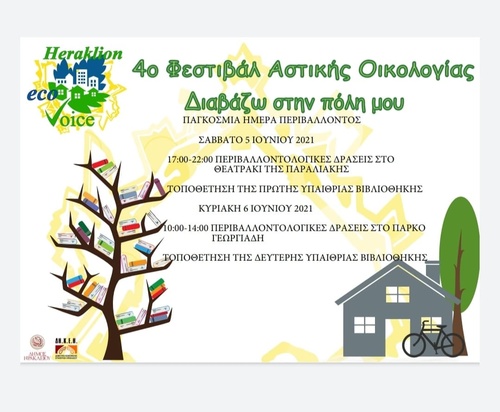 Συγκεκριμένα, το Σάββατο 5 και την Κυριακή 6 Ιουνίου, η εθελοντική ομάδα Herakion Eco Voice σε συνεργασία με την ΔΗΚΕΗ διοργανώνουν το 4ο Φεστιβάλ Αστικής Οικολογίας. Το πρόγραμμα του Φεστιβάλ περιλαμβάνει μεταξύ άλλων την τοποθέτηση δυο υπαίθριων βιβλιοθηκών με βιβλία και παραμύθια οικολογικού περιεχομένου, στο θεατράκι στον Καράβολα και στο Πάρκο Γεωργιάδη.