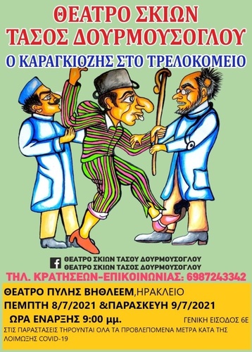 Στο πλαίσιο των εκδηλώσεων «Ηράκλειο- Καλοκαίρι 2021» στο ανοικτό θέατρο της «Πύλης Βηθλεέμ», το Θέατρο Σκιών Τάσος Δουρμούσογλου παρουσιάζει την παράσταση «Ο καραγκιόζης στο τρελοκομείο». Η παράσταση θα παρουσιαστεί δύο βράδια, την Πέμπτη 8 και την Παρασκευή 9 Ιουλίου στις 21:30.