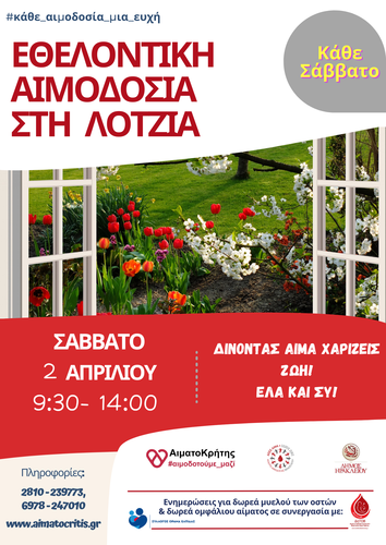 Εθελοντική αιμοδοσία θα πραγματοποιηθεί το Σάββατο 02/04/2022 στο κέντρο της πόλης του Ηρακλείου (στο Αίθριο της Λότζια), από τις 09:30 έως τις 14:00.