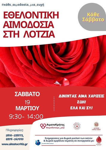Εθελοντική αιμοδοσία θα πραγματοποιηθεί το Σάββατο 19/03/2022 στο κέντρο της πόλης του Ηρακλείου (στο Αίθριο της Λότζια), από τις 09:30 έως τις 14:00.