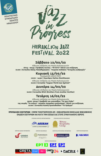 To Πολιτιστικό Συνεδριακό Κέντρο Ηρακλείου παρουσιάζει το «Jazz in Progress - Heraklion Jazz Festival 2022» από το Σάββατο 12 Φεβρουαρίου μέχρι και την Τετάρτη 16 του μήνα (12, 13, 14, 16/2). Πρόκειται για την τρίτη κατά σειρά διοργάνωση ενός θεσμού που ξεκίνησε τον Ιανουάριο του 2020 και που παραμένει ζωντανός και δυναμικός, έτοιμος να προσφέρει στο μουσικόφιλο κοινό, σπουδαίες και σπάνιες στιγμές καλλιτεχνικής δημιουργίας.