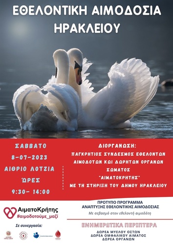 Εθελοντική αιμοδοσία θα πραγματοποιηθεί το Σάββατο 08/07/2023 στο κέντρο της πόλης του Ηρακλείου και συγκεκριμένα στο αίθριο της Λότζια από τις 9:30 έως τις 14:00.