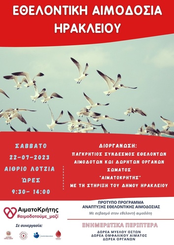 Εθελοντική αιμοδοσία θα πραγματοποιηθεί το Σάββατο 22/07/2023 στο κέντρο της πόλης του Ηρακλείου και συγκεκριμένα στο αίθριο της Λότζια από τις 9:30 έως τις 14:00.