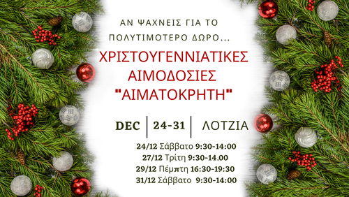 Συνεχίζονται οι εορταστικές εθελοντικές αιμοδοσίες την Πέμπτη 29/12/2022 και το Σάββατο 31/12/2022 στο κέντρο της πόλης του Ηρακλείου και συγκεκριμένα στο αίθριο της Λότζια από τις 9:30 έως τις 14:00 .