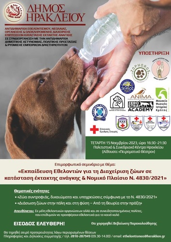 Ο Δήμος Ηρακλείου, δια της Αντιδημαρχίας Εθελοντισμού, Νεολαίας, Οργάνωσης και Ολοκληρωμένης Διαχείρισης Επιπτώσεων Κατάστασης Έκτακτης Ανάγκης, σε συνδιοργάνωση με την Αντιδημαρχία Πολιτικής Προστασίας, Δημοτικής Αστυνομίας και ρύθμισης Εμπορικών Δραστηριοτήτων , συνεχίζει τις δράσεις ενημέρωσης, ευαισθητοποίησης και εκπαίδευσης κοινού και εθελοντών με τη διοργάνωση επιμορφωτικού σεμιναρίου με θέμα «Εκπαίδευση Εθελοντών για τη Διαχείριση ζώων σε κατάσταση έκτακτης ανάγκης & Νομικό Πλαίσιο Ν.4830/2021».