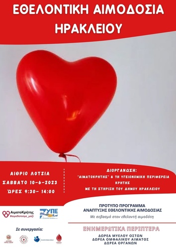 Εθελοντική αιμοδοσία θα πραγματοποιηθεί το Σάββατο 10/06/2023 στο κέντρο της πόλης του Ηρακλείου και συγκεκριμένα στο αίθριο της Λότζια από τις 9:30 έως τις 14:00 .