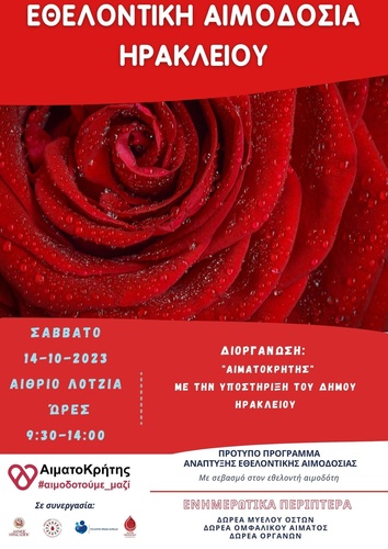 Εθελοντική αιμοδοσία θα πραγματοποιηθεί το Σάββατο 14/10/2023 στο κέντρο της πόλης του Ηρακλείου και συγκεκριμένα στο αίθριο της Λότζια από τις 9:30 έως τις 14:00.