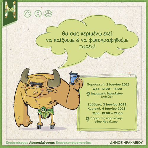Στις 2 Ιουνίου από τις 12:00 έως τις 14:00 στο αίθριο της Λότζια και στις 3 και 4 Ιουνίου από τις 19:00 έως τις 21:00 στον Καράβολα, στο περίπτερο του Δήμου Ηρακλείου στο Φεστιβάλ, δίνει την ευκαιρία στους μικρούς και μεγάλους κατοίκους του Ηρακλείου ρακλνα γνωρίσουν από κοντά τον ήρωα της Ανακύκλωσης. Παίζοντας με τον «Μίνω Ανακύκλωντα» τα παιδιά μπορούν να κερδίσουν δώρα και κυρίως να ενημερωθούν για την προστασία του περιβάλλοντος ενώ παράλληλα διασκεδάζουν.