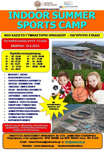 Ο Δήμος Ηρακλείου και η Ανάπτυξη Αθλητισμού Ηρακλείου ΑΕ ΟΤΑ ενημερώνουν τους δημότες ότι το Indoor Sports Camp που υλοποιείται με μεγάλη επιτυχία τα τελευταία επτά χρόνια, θα πραγματοποιηθεί και φέτος σε δύο φάσεις:
