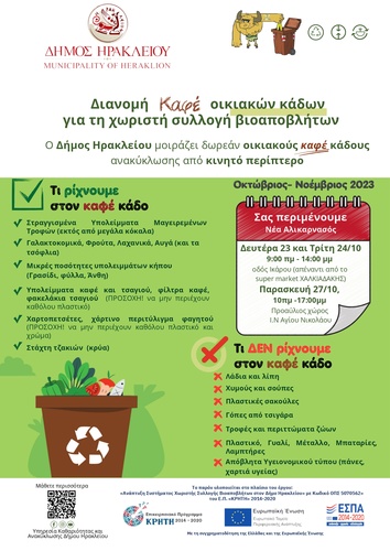 Ο Δήμος Ηρακλείου/Αντιδημαρχία Περιβάλλοντος και Κυκλικής Οικονομίας, στο πλαίσιο της εκστρατείας ενημέρωσης που υλοποιεί για το καίριο αλλά και δύσκολο βήμα της συλλογής των υπολειμμάτων από τις κουζίνες σπιτιών και επιχειρήσεων, συνεχίζει την δωρεάν διανομή οικιακών καφέ κάδων 10ltlt σε δημότες.