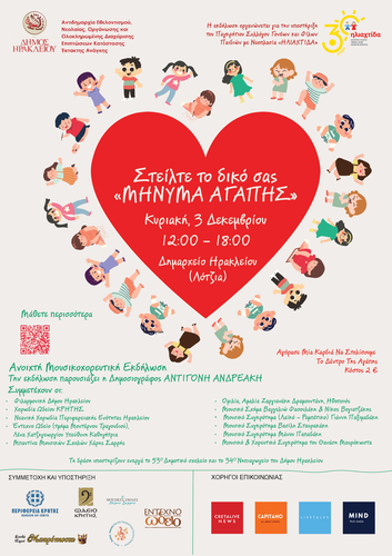 Συγκεκριμένα, την Κυριακή 3 Δεκεμβρίου (12:00 – 18:00), στη Λότζια διοργανώνεται Ανοιχτή Μουσικοχορευτική Εκδήλωση με τίτλο: «Στείλτε το δικό σας “ΜΗΝΥΜΑ ΑΓΑΠΗΣ”» για τη στήριξη του Παγκρήτιου Συλλόγου Γονέων και Φίλων Παιδιών με Νεοπλασία «Ηλιαχτίδα». Στόχος της εκδήλωσης είναι η συγκέντρωση χρηματικού ποσού που θα διατεθεί για τις ανάγκες της δομής ψυχοκοινωνικής στήριξης «Η Ηλιαχτίδα». Η εκδήλωση πραγματοποιείται με τη Συμμετοχή και Υποστήριξη καλλιτεχνών και μουσικών σχημάτων, ωδείων και μουσικών σχολών και σχολείων.