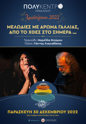 Γλυκές μελωδίες γαλλικού bistrot από την Μαριέλλα Βιτώρου στο τραγούδι και τον Γιάννη Κιαγιαδάκη στο πιάνο ζεσταίνουν την χριστουγεννιάτικη ατμόσφαιρα και μας μεταφέρουν στην Γαλλία του χθες και του σήμερα.