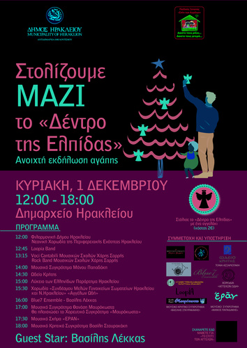 Την ανοικτή εκδήλωση αγάπης «Στολίζουμε ΜΑΖΙ το Δέντρο της Ελπίδας», με στόχο την ολοκλήρωση της Δομής «Σπίτι των Αγγέλων» του Συνδέσμου Μελών Γυναικείων Σωματείων Ηρακλείου και Ν. Ηρακλείου, διοργανώνει η Αντιδημαρχία Εθελοντισμού του Δήμου Ηρακλείου την 1η Δεκεμβρίου από τις 12:00 έως τις 18:00 δίπλα στη Λότζια με αφορμή την Παγκόσμια Ημέρα Εθελοντισμού.