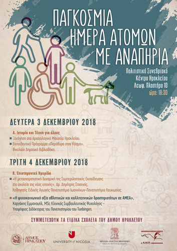 Με αφορμή την Παγκόσμια Ημέρα Ατόμων με Αναπηρία (3 Δεκεμβρίου), ο Δήμος Ηρακλείου προγραμματίζει μία σειρά δράσεις - εκπαιδευτικά προγράμματα καθώς και επιστημονική ημερίδα- την Δευτέρα 3 και την Τρίτη 4 Δεκεμβρίου σε συνεργασία με τη Βικελαία Δημοτική Βιβλιοθήκη, το Πανεπιστήμιο Λευκωσίας, το Αρχαιολογικό Μουσείο Ηρακλείου, τις Διευθύνσεις των Ειδικών Σχολείων της Πρωτοβάθμιας και Δευτεροβάθμιας Εκπαίδευσης Ηρακλείου και την πολύτιμη βοήθεια και στήριξη του Σωματείου Επαγγελματιών Ξεναγών Κρήτης και Σαντορίνης.