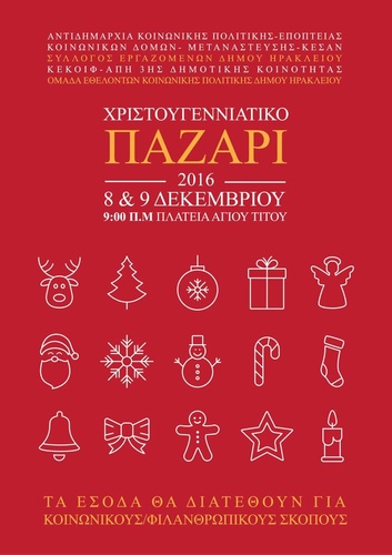 Χριστουγεννιάτικο παζάρι διοργανώνει η Αντιδημαρχία Κοινωνικής Πολιτικής σε συνεργασία με το Σύλλογο Εργαζομένων του Δήμου Ηρακλείου, το ΚΕΚΟΙΦ-ΑΠΗ της 3ης Δημοτικής Κοινότητας και την Ομάδα Εθελοντών Κοινωνικής Πολιτικής.