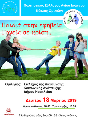 Το θέμα της ενημερωτικής συνάντησης είναι «Παιδιά στην εφηβεία. Γονείς σε κρίση…» και θα πραγματοποιηθεί από Στελέχη της Διεύθυνσης Κοινωνικής Ανάπτυξης Δήμου Ηρακλείου.